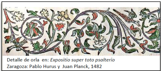del libro manuscrito al impreso: uno de los ejemplares presenta la orla xilográfica miniada en colores rojo, azul y dorado, siguiendo la